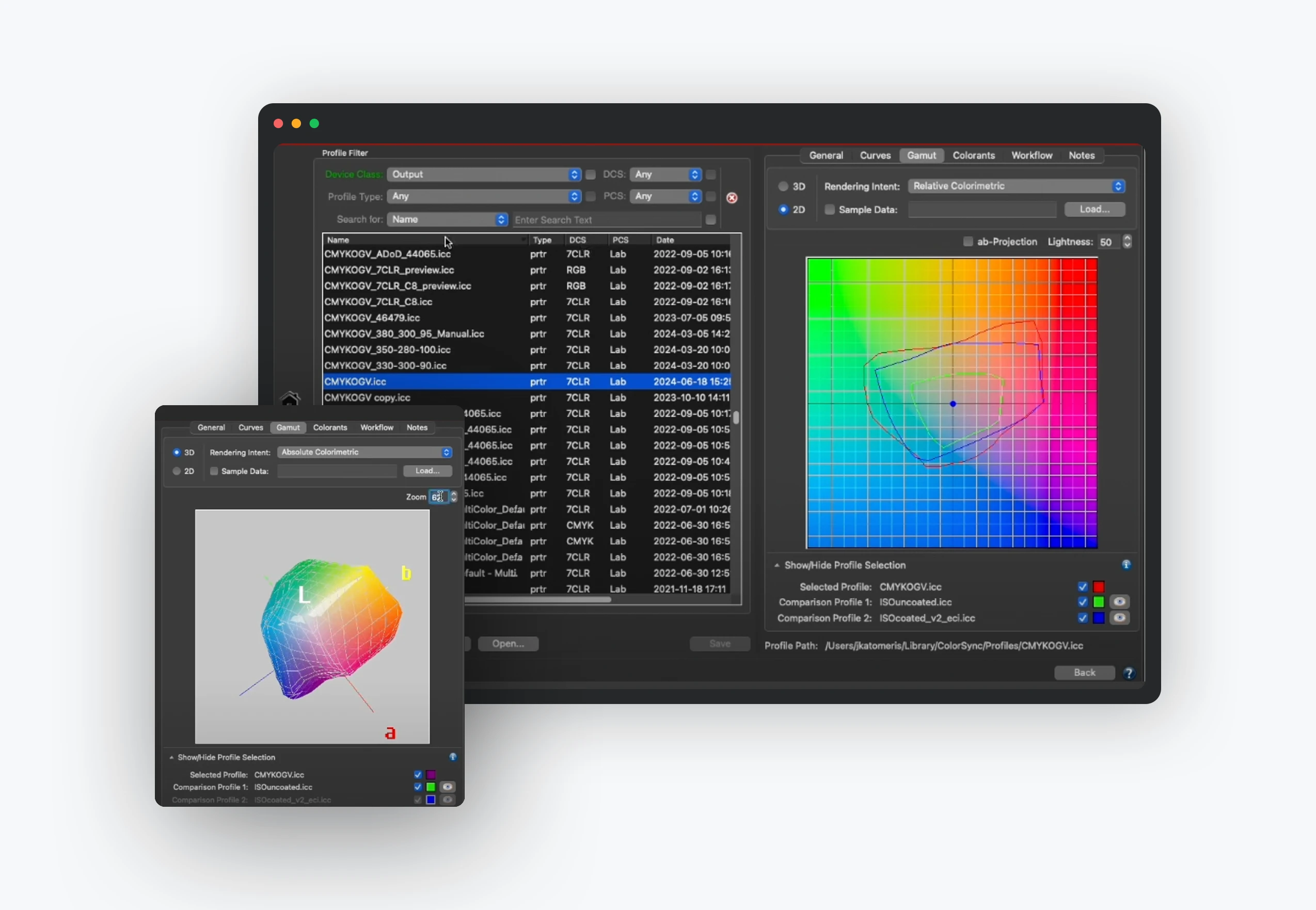 Qualitativ hochwertige DeviceLink-Profile für alle aktuellen internationalen Druckstandards für Konvertierung, Gesamtfarbauftrags-Beschränkung und Druckfarbeinsparung / Stabilisierung.